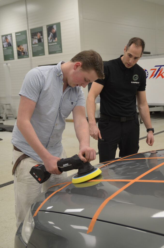 Etter mat ble ungdommene delt opp i grupper. Med ledsagere ble det muligheter til selv å teste ut ulike retninger inne bilfagene. Mekaniker lette kjøretøy, lakkfaget, skade og oppretting, bilpleie og bildelfaget hadde egne stasjoner der deltagerne i praksis kunne teste ut sine ferdigheter. Dette falt i god jord, og flere vi snakket med, synes dette var det aller morsomste.